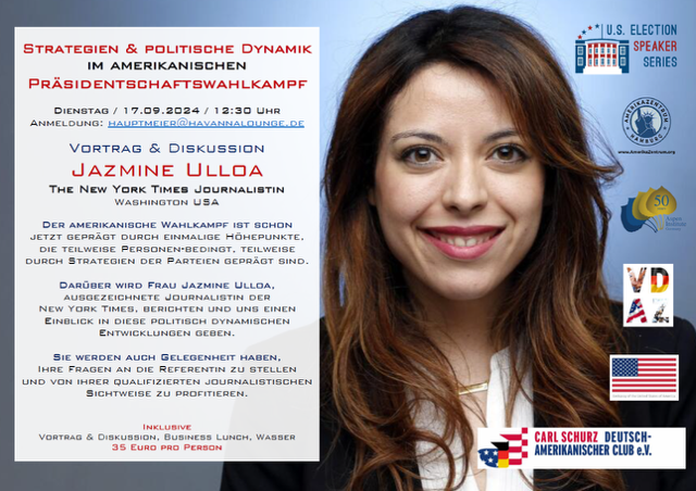 Der amerikanische Wahlkampf ist schon jetzt geprägt durch einmalige Höhepunkte, die teilweise Personen-bedingt, teilweise durch Strategien der Parteien geprägt sein. Darüber wird Frau Jazmine Ulloa, ausgezeichnete Journalistin der New York Times, berichten und uns einen Einblick in diese politisch dynamischen Entwicklungen geben.
